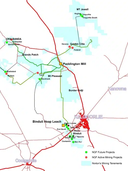 Norton Gold Fields tenement area covers 1,092km2 within the world-class Kalgoorlie gold province which includes the Paddington and Binduli Gold Operations.